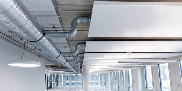 Für frische Luft und niedrige Betriebskosten sorgen zentrale VARIO Lüftungsgeräte mit Wärmerückgewinnung von VALLOX. Die geschossweise installierten Geräte aus der Commercial Line wurden mit Heiz- und Kühlregistern ausgestattet. So harmonieren sie energetisch mit den Heiz- und Kühldeckensegeln, die mit Fernwärme betrieben werden. Die effiziente Technik ist bewusst sichtbar an der Decke installiert – für einen modernen Industrie-Look.