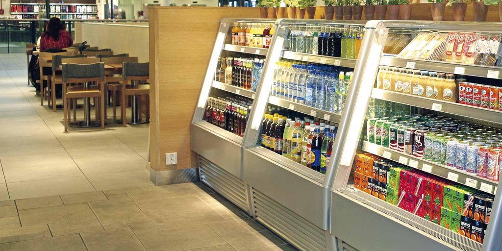 Offenes Kühlregal mit Getränke in einer Kantine