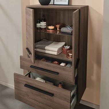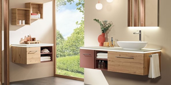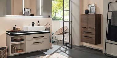 Extra-Slim, Slim-Light, Slim, Massivholz, Classic und Light in unterschiedlicher Optik – modellabhängig mit oder ohne LED, zusätzlich in Bi-Color. Flexible Gestaltung mit breiter oder schmaler vertikaler Platte. Fronten wahlweise mit Griff, mit Griffleiste oder grifflos mit integrierter Technik Push to open. Clevere Details wie ein Wäschebehälter im Schrank, eine Sitztruhe für mehr Komfort und vieles mehr. Maßflexible, offene Regale in nahezu allen Breiten ermöglichen auch in schwierigen Raumsituationen die passgenaue Planung. Verschiedene Keramik-Becken oder edle Glas-Waschbecken wählbar. Imposante Auswahl an Größen, Formen, Materialien und Farben für jeden Einrichtungsstil