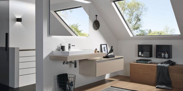 Das geräumige Solitärmöbel in Sandgrau-Matt und die gleichfarbige 2morrow Platte Classic ergänzen sich optimal. Die schwebende, asymmetrische Anordnung sorgt für Stauraum mit großzügigen Ablageflächen und erzeugt dabei eine Leichtigkeit, die durch den Reflection Lichtspiegel LUCA noch unterstützt wird. Zusammen mit platzsparenden Cubes in Kontrastfarbe entsteht eine moderne Badlösung.